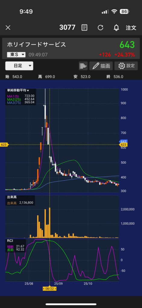 似たような低時価総額の短期吊り上げ低時価総額マネゲ株の高値圏大陰線ストップ安張り付け引けの過去事例を見てたら、大幅GDからの上ヒゲで前日終値超えてくる動きのパターンだけが見つかって想定できたけど、これでクロスで買って死んだら完全に今年の利益が飛んじゃうと思って流石に寄りクロスで買い繋げなかった、、、そしたらなんと大陽線で前日終値超えてきた、、、