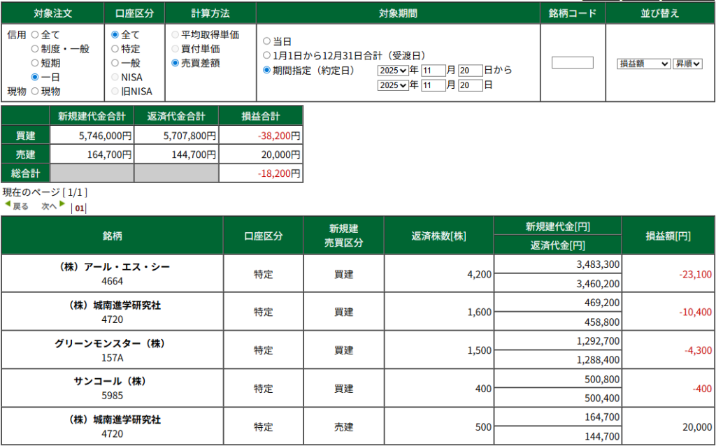 9時~15時30分まで成績 -18200 確定:-18200 含み:±0