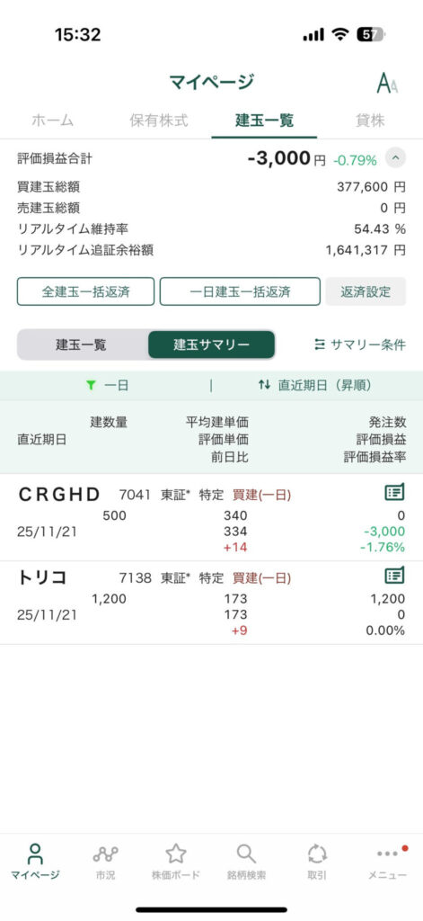 9時~15時30分まで成績 +47700 確定:+49300 含み:-1600