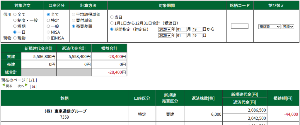 HOME > 今日のトレード結果 > 2026年デイトレード結果 > 2026年デイトレード結果 ネボウ✖ト✖フツカヨイ 1/19(月)デイトレード結果 2026年10営業日目 2026年1月21日 日曜日は新年会があって、それ自体は終電では家に帰ってきたのですが、そこからほぼオールしてしまって朝の7時とかに寝たら当たり前に起きられずに12時過ぎに起きました。 それで後場から二日酔いの中でわざわざトレードしたら順当に負けた笑笑 本日のデイトレ -2万7300円 デイトレのみ年初来 -10万1356円 年初来 +61万円くらい? ブログランキング参加中 ブログ更新の励みになるのでクリックしていただけたら嬉しいです。 株式デイトレードランキング Twitter Share Pocket Hatena LINE コメント URLコピー -2026年デイトレード結果