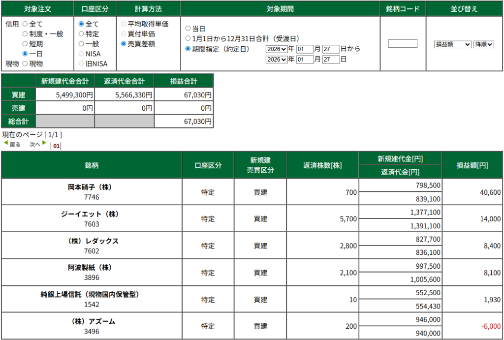 本日のデイトレ +6万9530円
