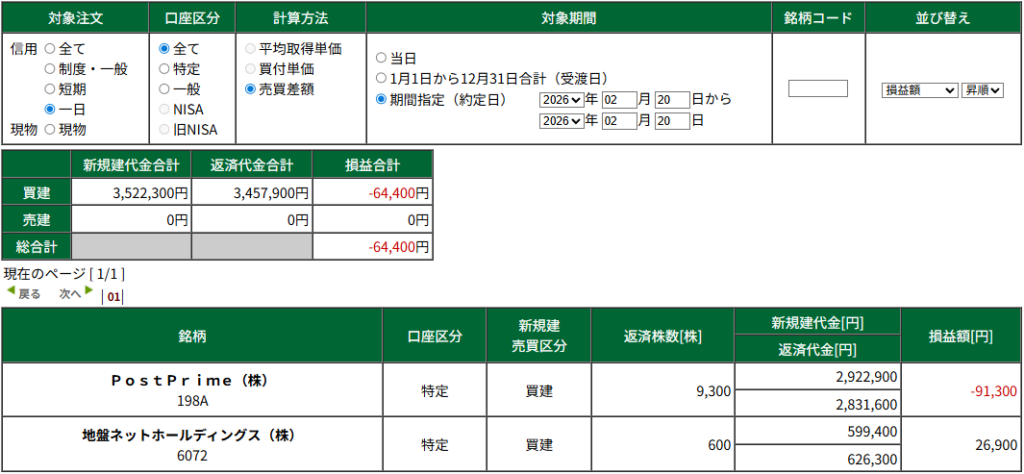1月デイトレのみ -7万2064円