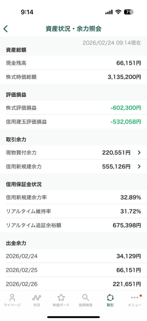 明日、2/25(水)、本来デイトレ口座である松井証券でのポジションを全て捨てて、まっさらな状態で、たくさんの余力でデイトレ王子としてやり直す!