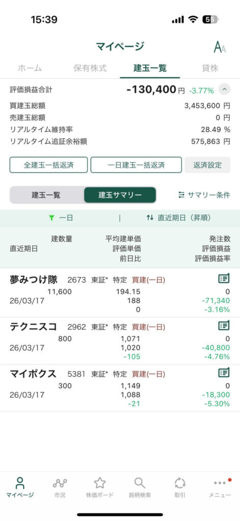 松井証券だと強制決済手数料は1銘柄3575円なので3銘柄で強制決済手数料だけで1万725円でシンドイです。