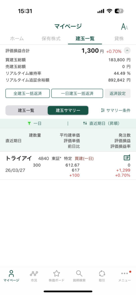 寄り前の時点でデイトレするための新規余力が120万円か130万円くらいしかなくてもうカツカツ