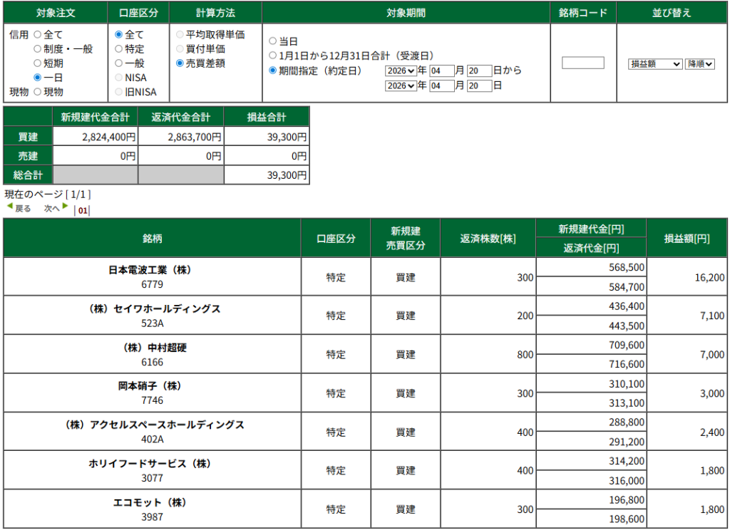 本日のデイトレ +41700円